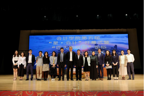 2019年3月21日下午3:00-5:00,由广东外语外贸大学会计学院和安永华明会计师事务所(特殊普通合伙)广州分所共同主办的第五届“星•会计”学术文化节开幕式暨“四大面对面”论坛在南校区大会堂举行。安永华明会计师事务所审计合伙人黄寅先生、毕马威华振会计师事务所税务合伙人何莹女士、普华永道中天会计师事务所审计高级经理杜维伟先生、德勤华永会计师事务所税务高级经理林健涛先生,广东外语外贸大学会计学院党委书记谢伟光老师、党委副书记杜焕君老师、广东外语外贸大学校团委龙飘飘老师,山东财经大学会计学院党委副书记付亚老师、教研室主任张彦国老师、团委书记于苗老师,以及各事务所人力资源部工作人员,各兄弟学院团委书记、辅导员老师出席开幕式。