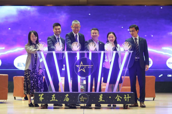 随后,会计学院谢伟光书记、安永华明会计师事务所黄寅先生,毕马威华振会计师事务所何莹女士,普华永道会计师事务所杜维伟先生、德勤华永会计师事务所林健涛先生、校团委龙飘飘老师一起上台,共同聚力,正式启动第五届“星•会计”学术文化节。