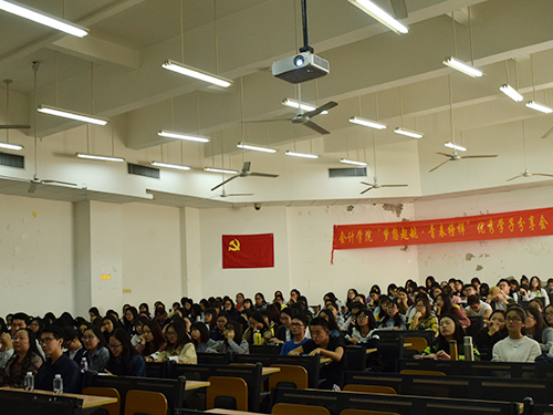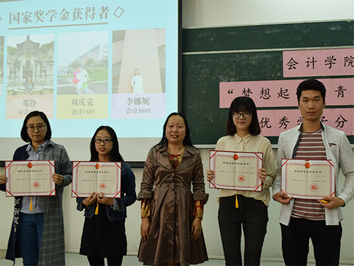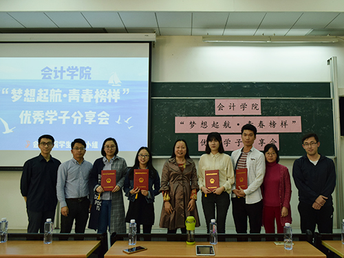 2018年3月22日,会计学院“梦想起航·青春榜样”优秀学子分享会在南校区教学楼F315顺利举行。在这次分享会上,会计学院荣获国家奖学金的四位同学分享了他们的经历和感悟,激励了广大学子勤奋学习、坚定理想信念,立志投身于伟大中国梦的生动实践中。会计学院党委副书记黄晓梅、辅导员沈长霞、邓海清、丁建新、李浩然等出席了会议。