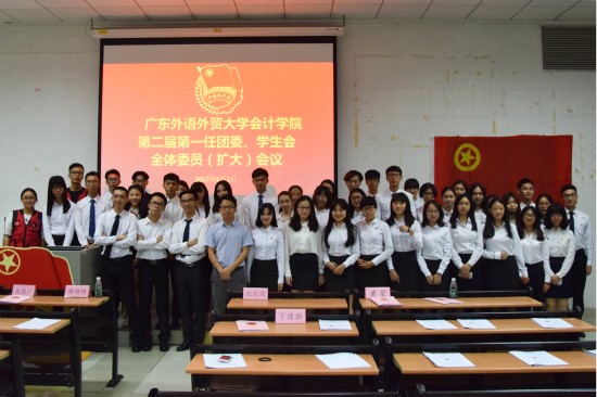 2017年6月1日晚上19:00,广东外语外贸大学会计学院第二届第一任团委、学生会全体委员(扩大)会议在教学楼F208隆重召开。出席本次会议的嘉宾有校团委副书记刘郎老师,会计学院党委副书记黄晓梅老师,经贸学院团委书记吴廷广老师、金融学院团委书记陈璟明老师、会计学院团委书记邓海清老师、14级辅导员沈长霞老师,13级辅导员黄星老师以及16级辅导员丁建新老师。