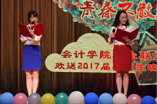 2017年5月22日星期一晚7点,会计学院校企联合欢送2017届毕业生晚会在南校学生活动中心隆重举行。出席晚会的嘉宾有:广东正中珠江会计师事务所党办主任、总支委员解胜美女士;人力资源部经理、第一支部书记王纯女士;会计学院院长刘中华老师、党委书记孙家和老师、副院长汤胜老师、左志刚老师、党委副书记黄晓梅老师、审计系系主任黄浩老师、会计学院团委书记邓海清老师、13级辅导员周雅颂老师、黄星老师、14级辅导员沈长霞老师以及16级辅导员丁建新老师。
