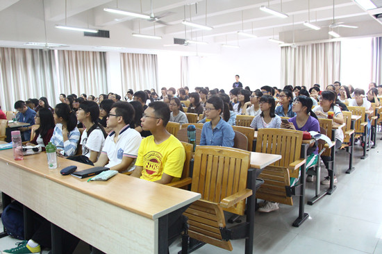 紧接着是2012级大四师兄师姐的经验交流部分。他们为大一新生分享了他们对于大学生活的经验和感悟。首先,龙澜同学发言。他先是引用一则名言“少一些功利主义的追求,多一些不为什么的追求”,以此来激励对未来感到迷茫的新生们。然后,他具体分析了当下的专业就业的竞争压力和商科的就业去向,以及如何定位自己。接着,罗泳欣同学就英语在就业中的重要性展开演说。她分享了自己丰富的就业面试和考取雅思、商务英语考试证书的经验,还推荐了一些很有价值的学习网站。最后,代表梁嘉明同学出席的廖炫钧同学播放了梁嘉明特意录制的视频。视频中,梁嘉明分享了他从大一到大四精彩的大学生活,并鼓励新生们相信自己,相信因缘,多点尝试。