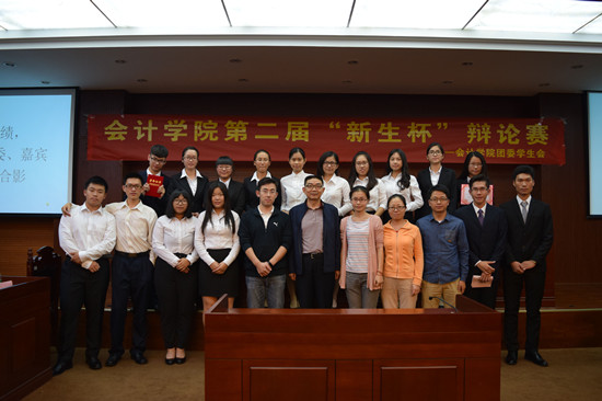 11月3号晚上6:30,由会计学院团委学生会和会计学院辩论队主办的新生杯辩论赛在实验楼第一模拟法庭隆重举行。此次大会特邀会计学院党委书记孙家和、会计学院团委书记周雅颂,辅导员沈长霞、邓海清、丁建新,团委副书记和学生会正副主席出席。到场的还有14级的辩论队队长及15级新生,热闹非凡。