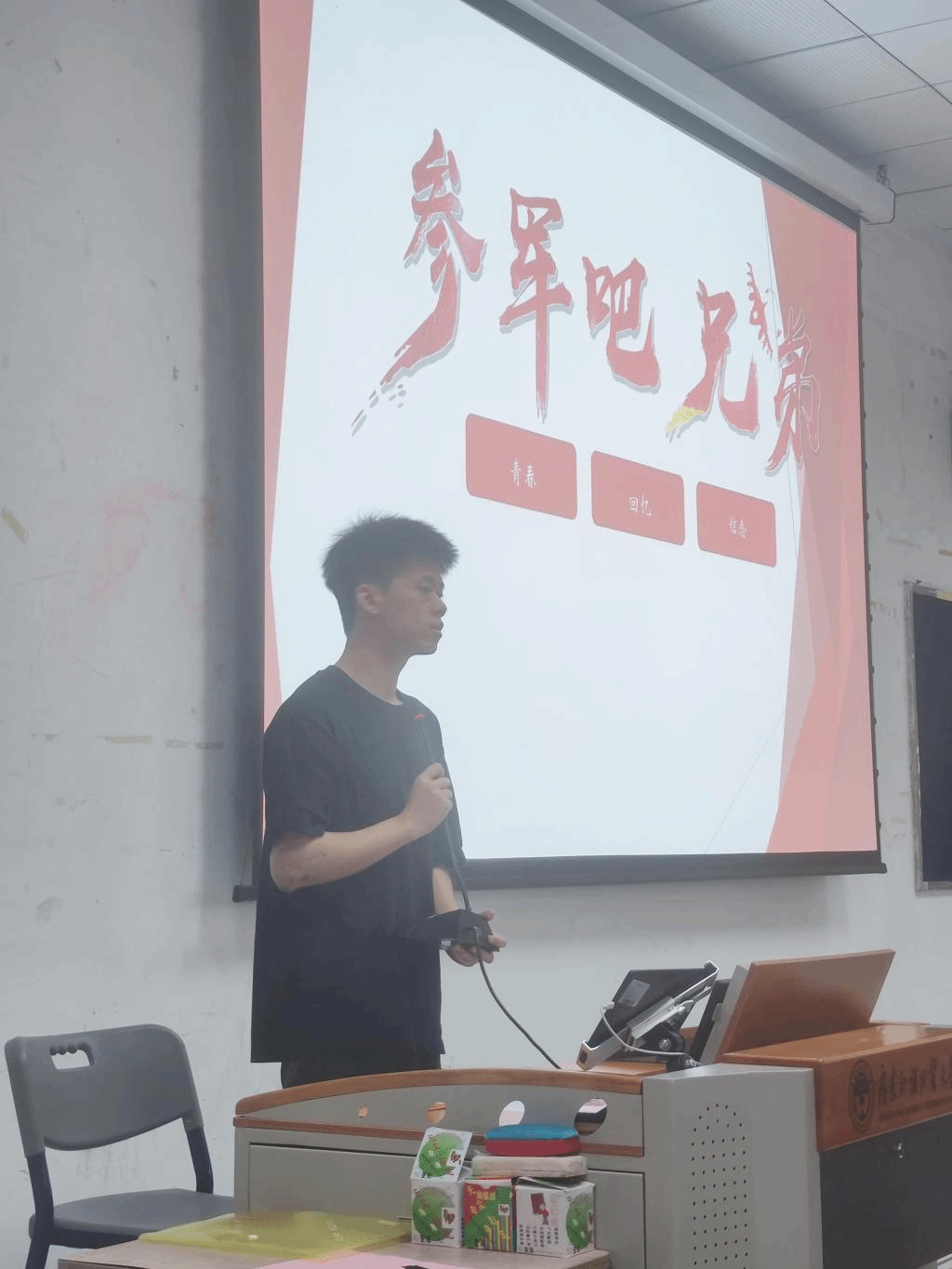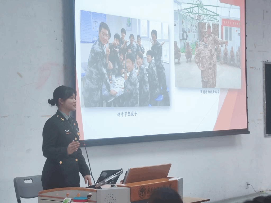 黄鸿照同学用一张张照片、一段段视频带领同学们回顾自己在部队中开坦克、举炮弹、参与抗洪救灾、作为教官带大一新生军训的故事,每一个瞬间都凝聚着他的汗水与荣耀,每一段故事都彰显着他对国家和人民的忠诚与担当。他借此机会鼓励会院的学子们积极投身军旅,通过参军入伍这一特殊的途径,不仅能够锤炼个人的意志和能力,更能实现更高远的人生理想。