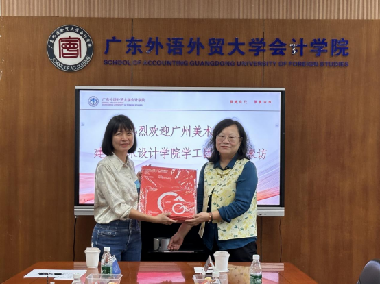 会后,钱缨代表建筑艺术学院向会计学院赠予了广州美术学院建校70周年纪念文创,并做合影留念。