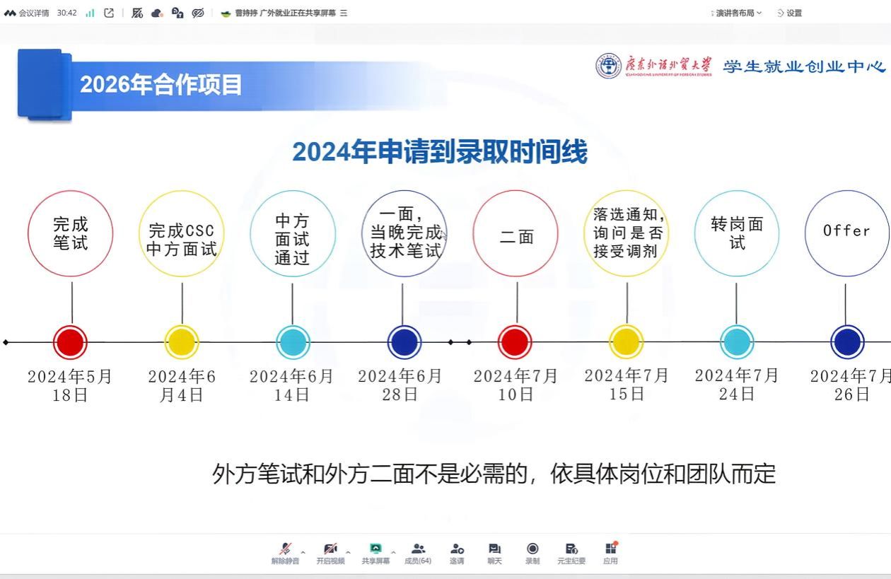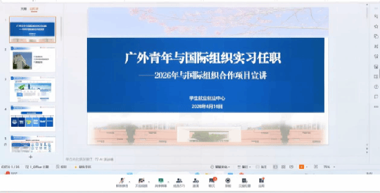 为深入落实学校国际化办学特色,助力学生把握国家留学基金委国际组织实习机遇,提升全球胜任力与职业竞争力,4月16日晚,会计学院通过举办了2026年国家留学基金委与有关国际组织实习生合作项目专题宣讲会。本次宣讲会由周雅颂主持,学校就业创业指导中心曹婷婷主讲,学院近百名学生线上参会学习。