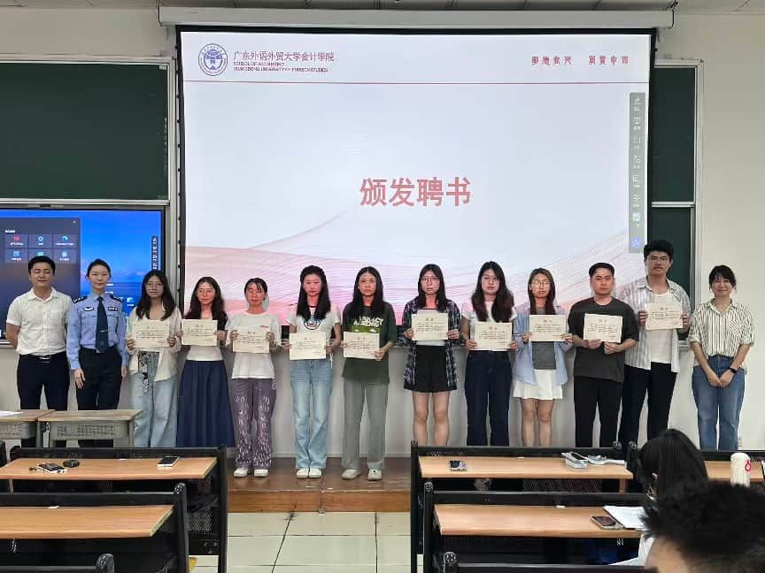 为构建长效反诈宣传机制,会计学院创新推出“每班一宣传员”制度,并现场为10名“学院征兵反诈宣传员”代表颁发聘书。该制度依托学生骨干力量,将反诈知识与征兵政策精准传递至每个班级,形成“全覆盖、网格化”宣传体系。根据制度要求,反诈宣传员需及时在班级群发布反诈提醒,并至少每月一次利用课间或班级活动时间,为同学宣讲诈骗案例及反诈知识,切实打通安全教育“最后一公里”。