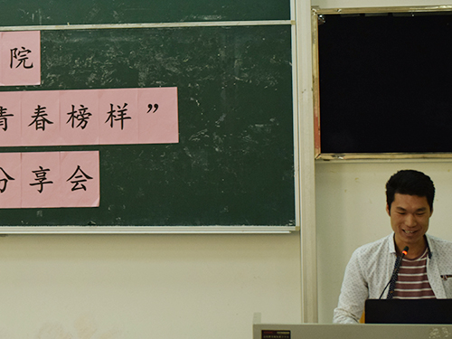 大三的刘庆克则展示了自己从大一到大三丰富多彩的成长历程。其间所遇到的困难和挫折,都被他用自信和从容的话语雕塑成一幅幅生动的画面,现场的同学不时给予热烈的掌声和笑声。