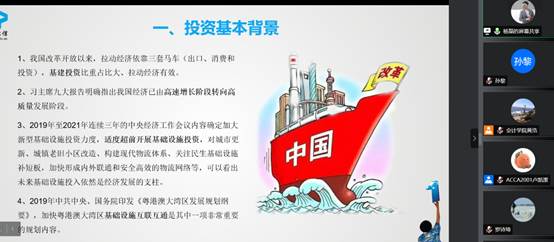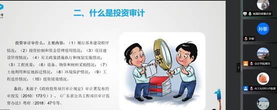 接着杨磊老师进一步向同学们系统性地介绍了什么是投资审计和其审计审的十大项主要内容。投资审计是在固定资产投资过程中,为了健全投资管理机制、制止盲目建设、节约建设资金、保证投资来源正当、使用合理、改善原有生产力布局、提高经济效益而对建造、购置或更新固定资产的经济活动进行的监督、检查。此外,杨老师还从财政投资,国有企业投资和民企投资这三大类不同的投资主体,给同学们具体解释和对比了不同投资主体的主要业务流程步骤以及其差异。
