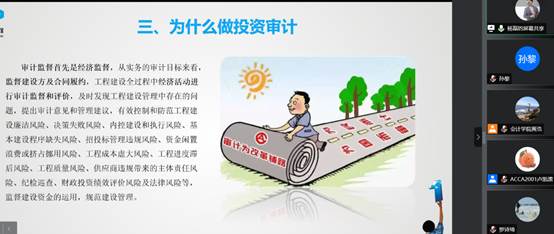 接着,杨磊老师深入讲解了为什么要做投资审计。开展投资审计业务有利于促进审计经济监督职能的优化,对工程建设全过程经济活动进行审计监督和评价,及时发现问题,提出审计意见和管理建议,能够有效的控制和防范如工程廉洁风险、招投标管理违规风险、内控建设和执行风险等各类风险的发生。