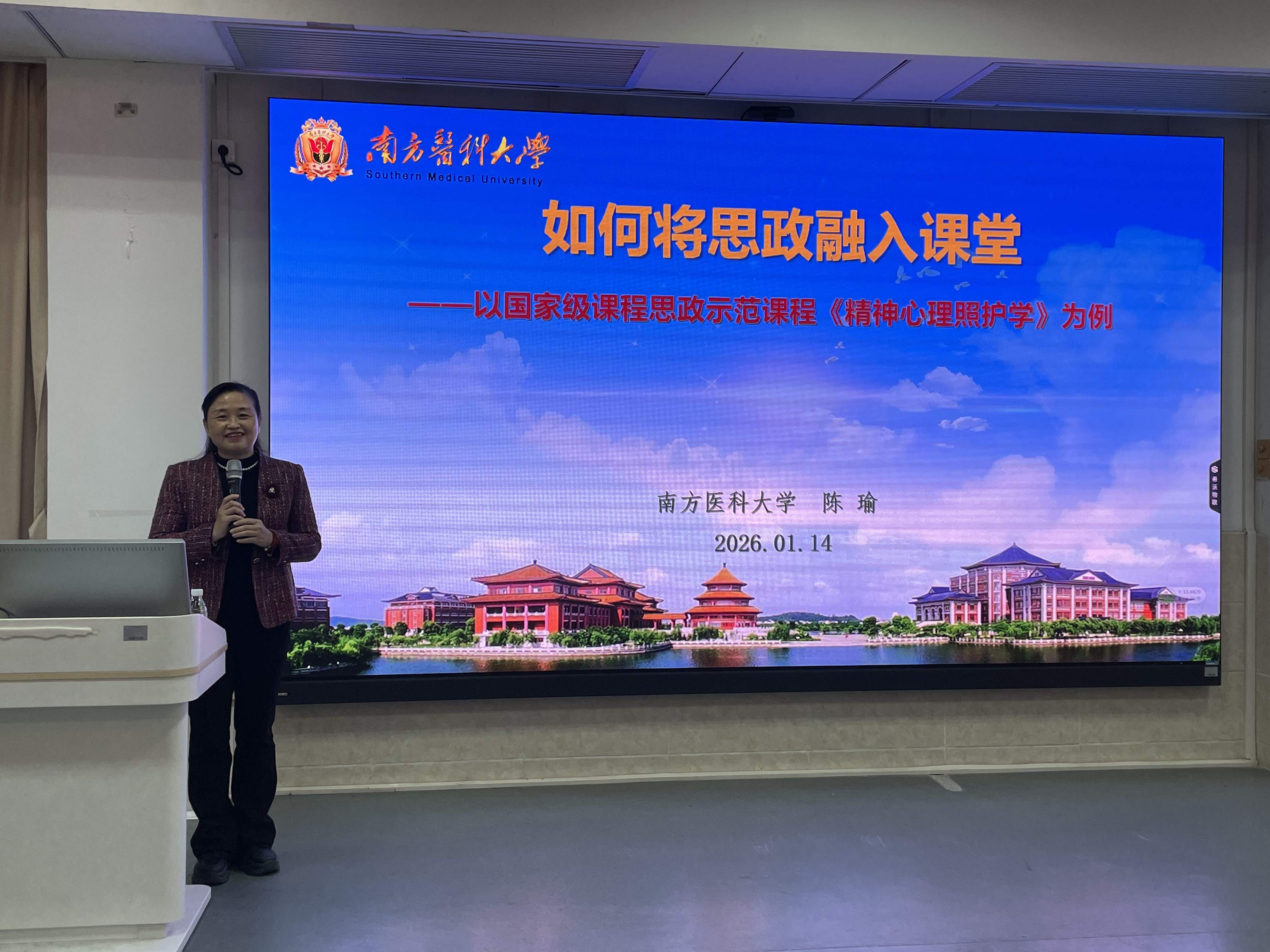 2026年1月14日上午,会计学院教学实践周“尚行论坛”第十四期著名教授讲座在大学城校区教学楼D312顺利举行,学院全体教职工参加此次讲座。此次讲座特邀南方医科大学陈瑜教授主讲,以“如何将思政融入课堂——以国家级课程思政示范课程为例”为主题,由会计学院黄浩副院长主持。