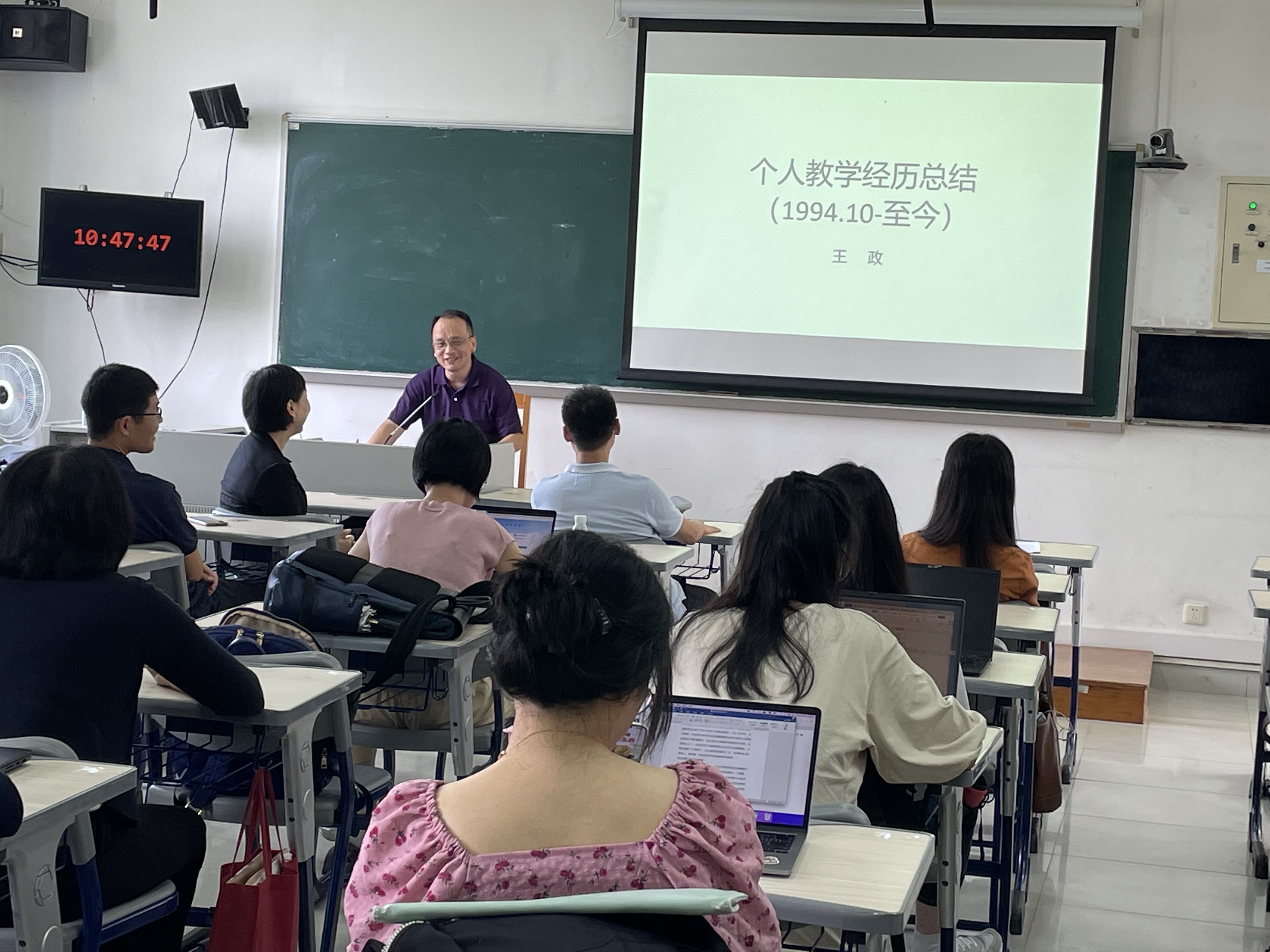 王政教授分享了他个人三十年的从教经历,由第一次走上讲台的窘迫、从当时的自我评价等曾经的困惑到经过三十年的春风化雨、言传身教,点滴积累、不断探索和提炼得到的教学经验总结。王教授指出,作为一名合格的人民教师,必须以恪守职业道德为指导,贵在坚持和不断的学习(继续教育);王教授还传授了一些实用教学经验和个人技能提升的要点:课程与时俱进、教学手段更新、积极参加教学研讨、师资培训,开拓视野和向社会学习。具体策略有注重学生需求、注重教学评估结果、注重课堂气氛、注重细节和严格要求。王教授幽默风趣的表达和朴实凝练的教学语言让参训教师们获益良多。