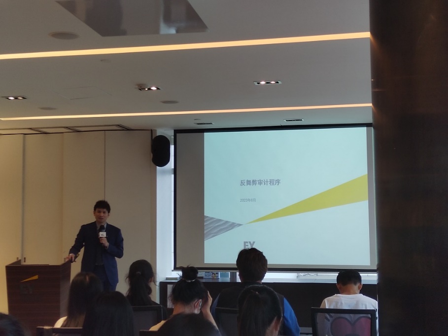 随后,审计合伙人Eric为同学们带来了主题为“反舞弊审计程序”的课程内容。Eric结合实际案例来讲解在审计实务中会遇到的舞弊情况,展示了在反舞弊审计的实际工作中所运用的审计程序,例如背景调查、匿名实地走访、比对金税系统数据、企业信用报告核对等。在此过程中,Eric提到大数据和数据分析技术的进步令审计工作发生了不少变化,他建议同学们要有良好的学习态度和学习能力,积极学习新知识和新技术。
