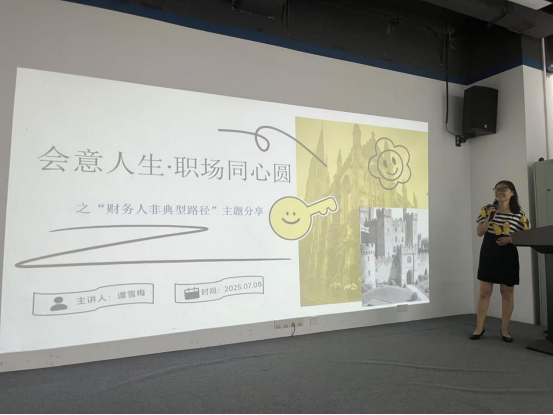 参观完毕,谭雪梅师姐在会议室分享了她的财务人非典型职业路径。她通过自身经历向同学们展示和强调了会计技能的跨界价值。作为会计专业学生,谭雪梅在毕业后却涉足了工地行政、超市创业、户外团建培训等多个领域,她结合自身经历指出,会计是“职场万金油”,其专业技能在各行各业都能为工作赋能,如在处理企业账期、成本核算、风险管控等方面发挥关键作用。同时,她强调对广外学生而言,双语财务能力是重要竞争力,建议同学们尽早通过社团活动、实习实践提升自身,并重视人脉积累,在努力学习专业知识的基础上,培养沟通合作等综合能力,鼓励大家“在数字里保持清醒,在规则中不忘创新,走出有奔头、有理想、有后劲的人生路”。